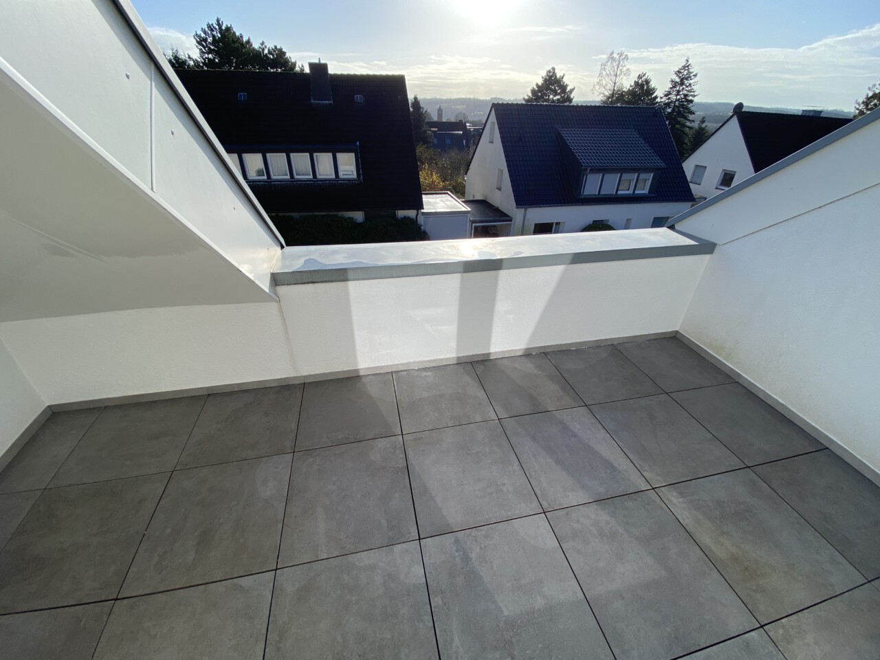 – Loggia mit modernen Terrassenplatten in hellgrau und Weitblick