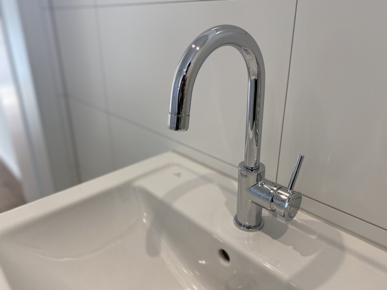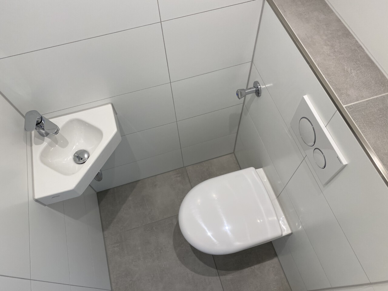 – Weiße Keramik, wandhängendes WC von Villeroy&Boch und Armaturen aus Chrom von Grohe