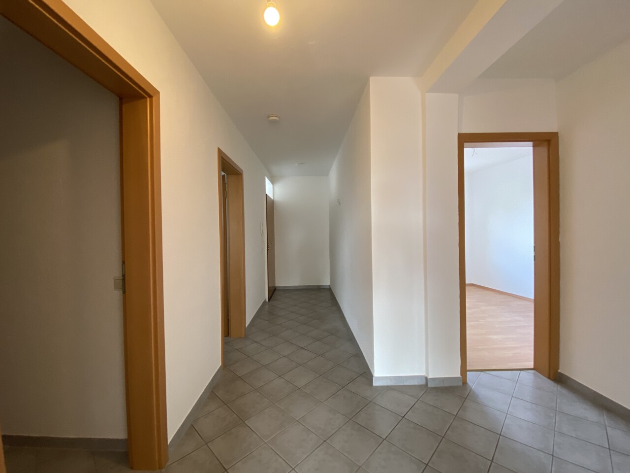 Über die Diele erreicht man auf der rechten Seite die Küche und den Abstellraum. Zur linken liegen das erste Zimmer, sowie das Bad mit Dusche. Geradeaus befinden sich zwei fast gleich große Zimmer, wovon eins direkten Zugang zum Balkon hat, mit Blick in den schönen Garten. Zudem gehört zu der Wohnung ein Kellerraum.